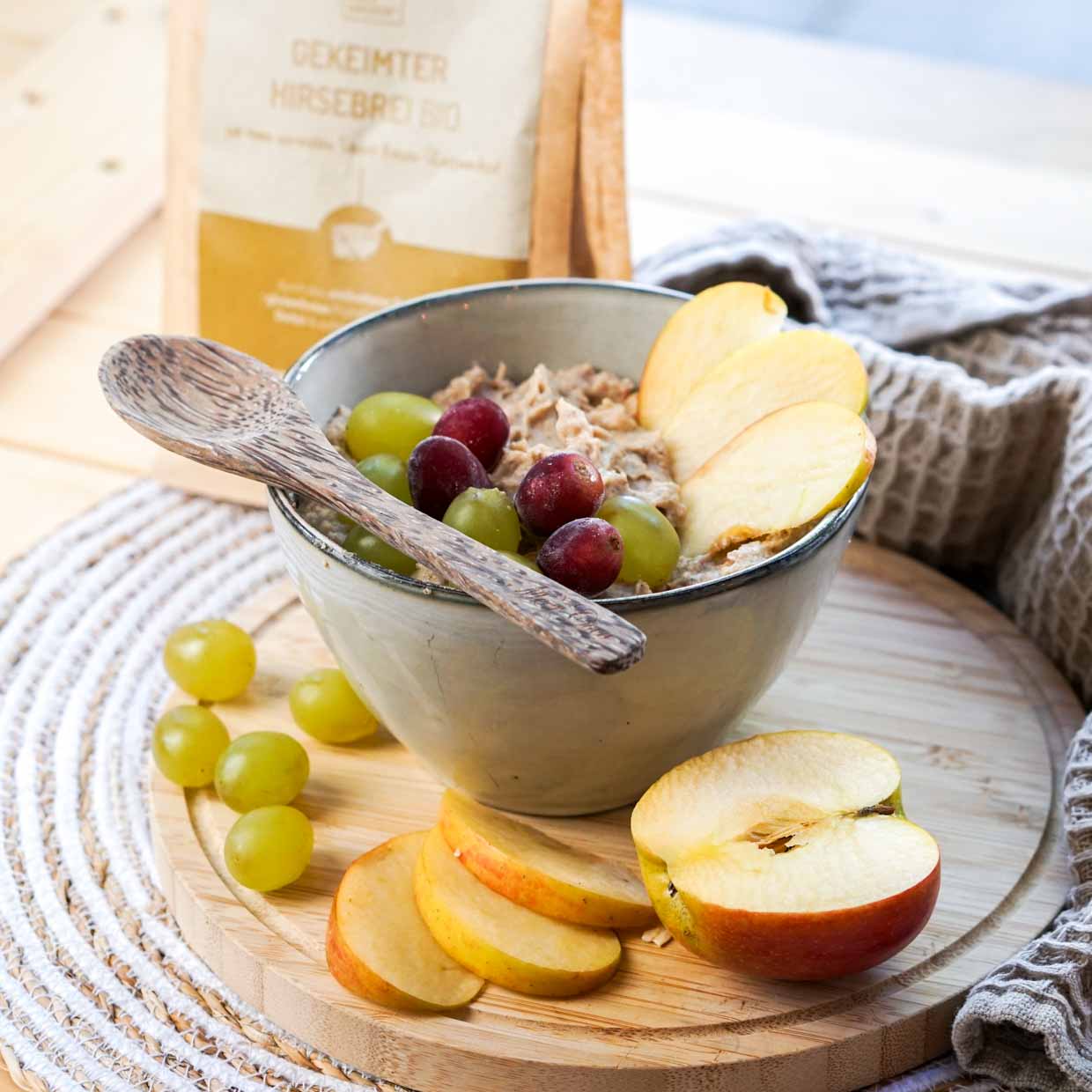 Gemahlene, angekeimte Hirse mit getrockneten Apfelstückchen, Dattel und Ceylon Zimt. Hört sich lecker an? Ist es auch! Ganz nebenbei bringt dich unser Hirsebrei dank des hohen Ballaststoffgehalts auch gut durch den Tag. Außerdem ist er schnell zubereitet: Koche einfach deine Lieblingsflüssigkeit, zum Beispiel pflanzliche Milch oder Wasser, auf und rühre ein paar Esslöffel Hirsebrei ein, lass ihn kurz quellen und fertig ist dein warmes, glutenfreies Frühstück!