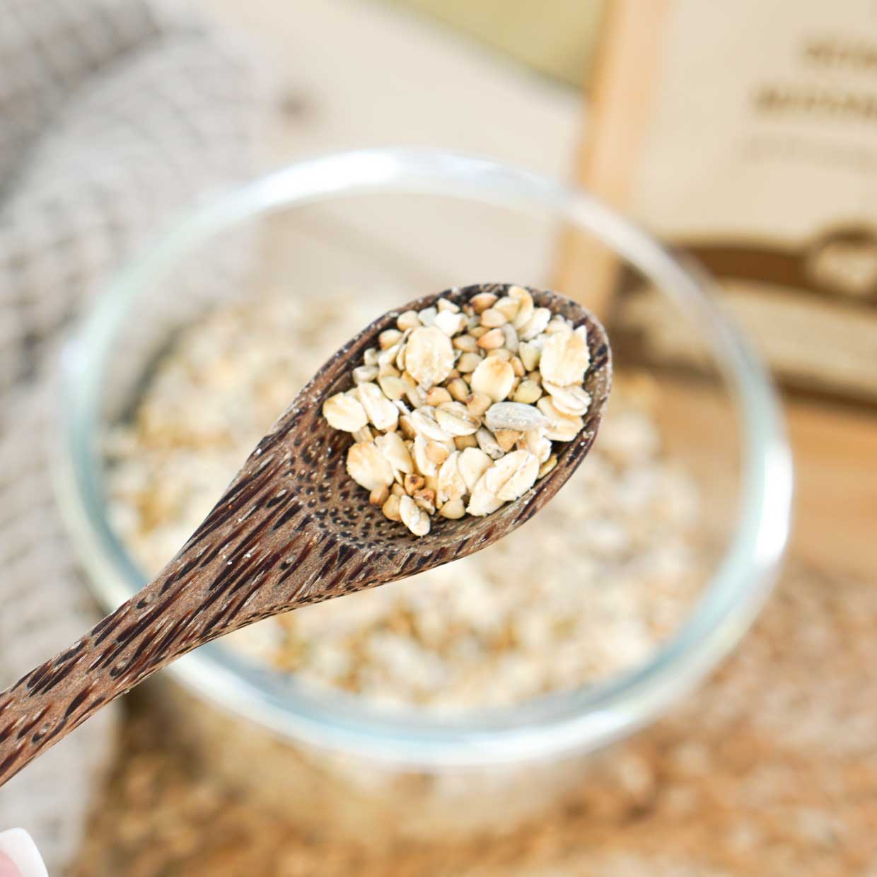 Zutaten: Haferflocken* gekeimt 40%, Buchweizen* gekeimt 40%, Macadamia* gehackt 8%, Mandeln* gehackt 6%, Sonnenblumenkerne* 6%.