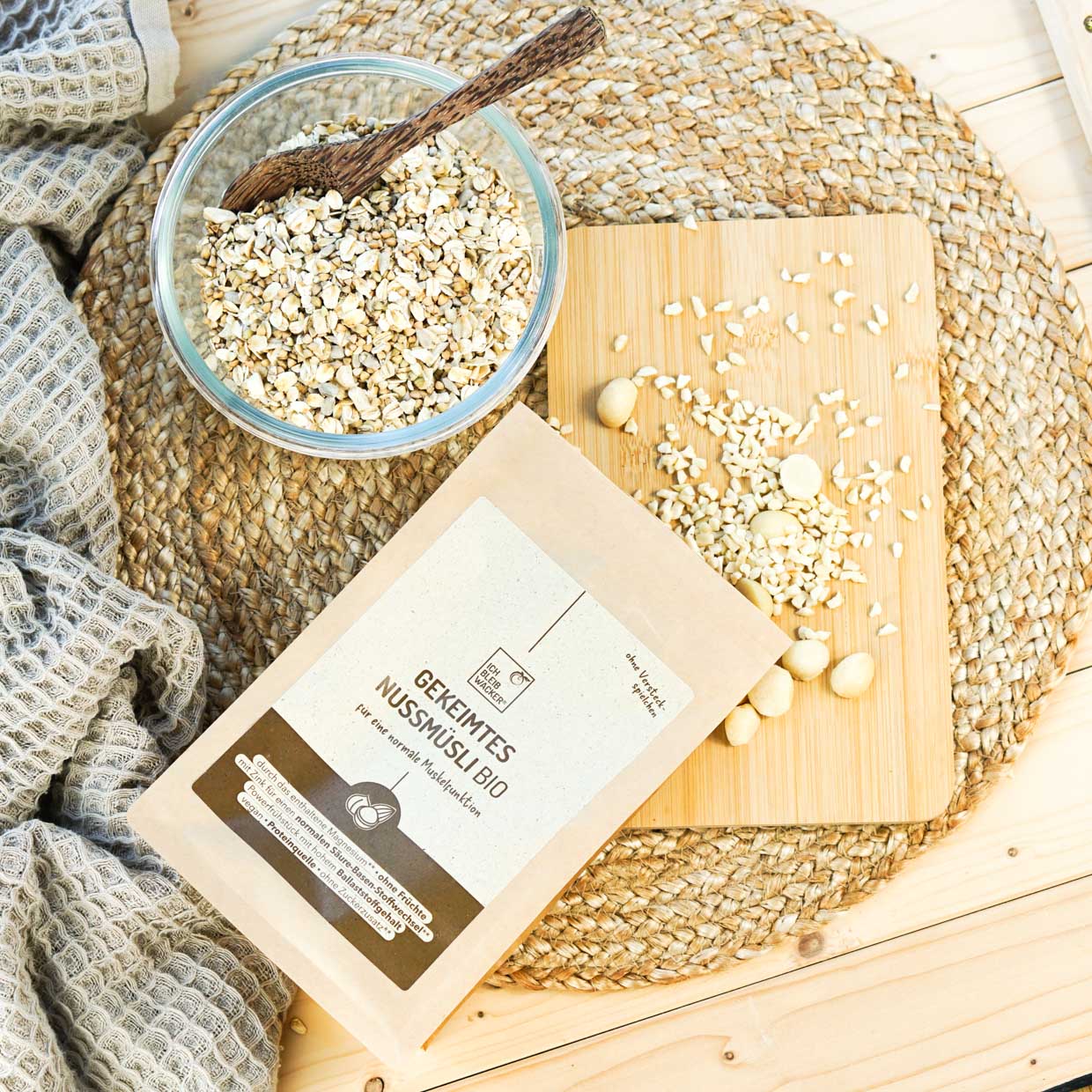 Dazu kommen gekeimter Buchweizen, Macadamianüsse, Mandeln und Sonnenblumenkerne.