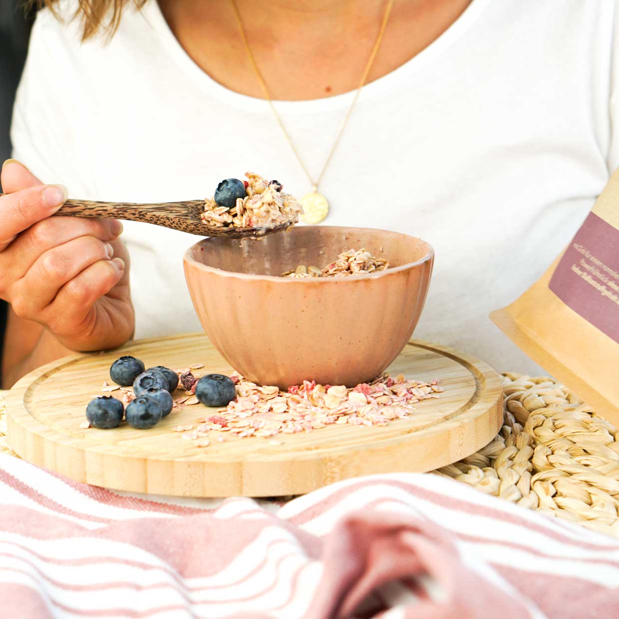 Warum unser gekeimtes Beerenporridge Dein neuer Lieblingsbegleiter am Morgen sein wird? Ganz einfach: Es steckt voller gefriergetrockneter Erdbeeren und getrockneter Blaubeeren! Das enthaltene Eisen hilft gegen Müdigkeit und Ermüdung – ideal für all jene, die oft einen zweiten Anlauf am Morgen brauchen. Außerdem unterstützt das enthaltene Zink Deinen normalen Säure-Basen-Stoffwechsel. Das Getreide in unserem Porridge wird kontrolliert angekeimt. Dazu wird das Korn zunächst in Wasser eingeweicht und anschließend regelmäßig mit Wasser gespült, bis ein kleiner Spross aus ihm wächst. Kurz nach dem Durchbruch des winzigen Sprosses wird es mit einem speziellen Verfahren getrocknet und so der Keimvorgang gestoppt.