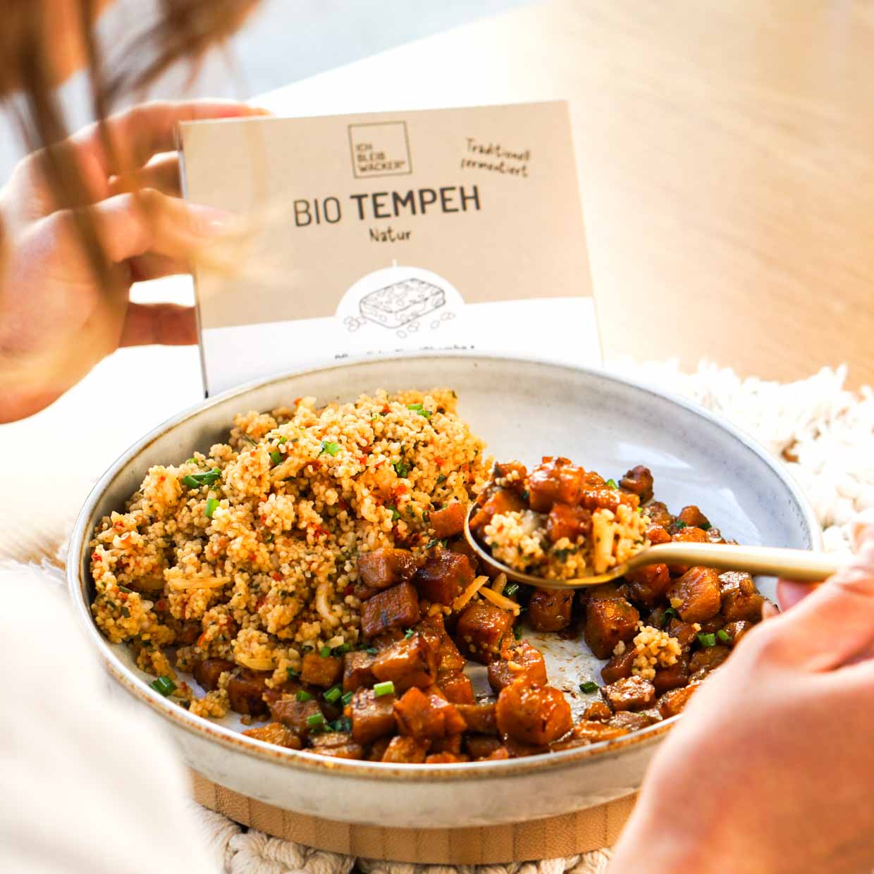 Der Tempeh nimmt die Aromen auf und kann für jedes Gericht passend gewürzt werden.