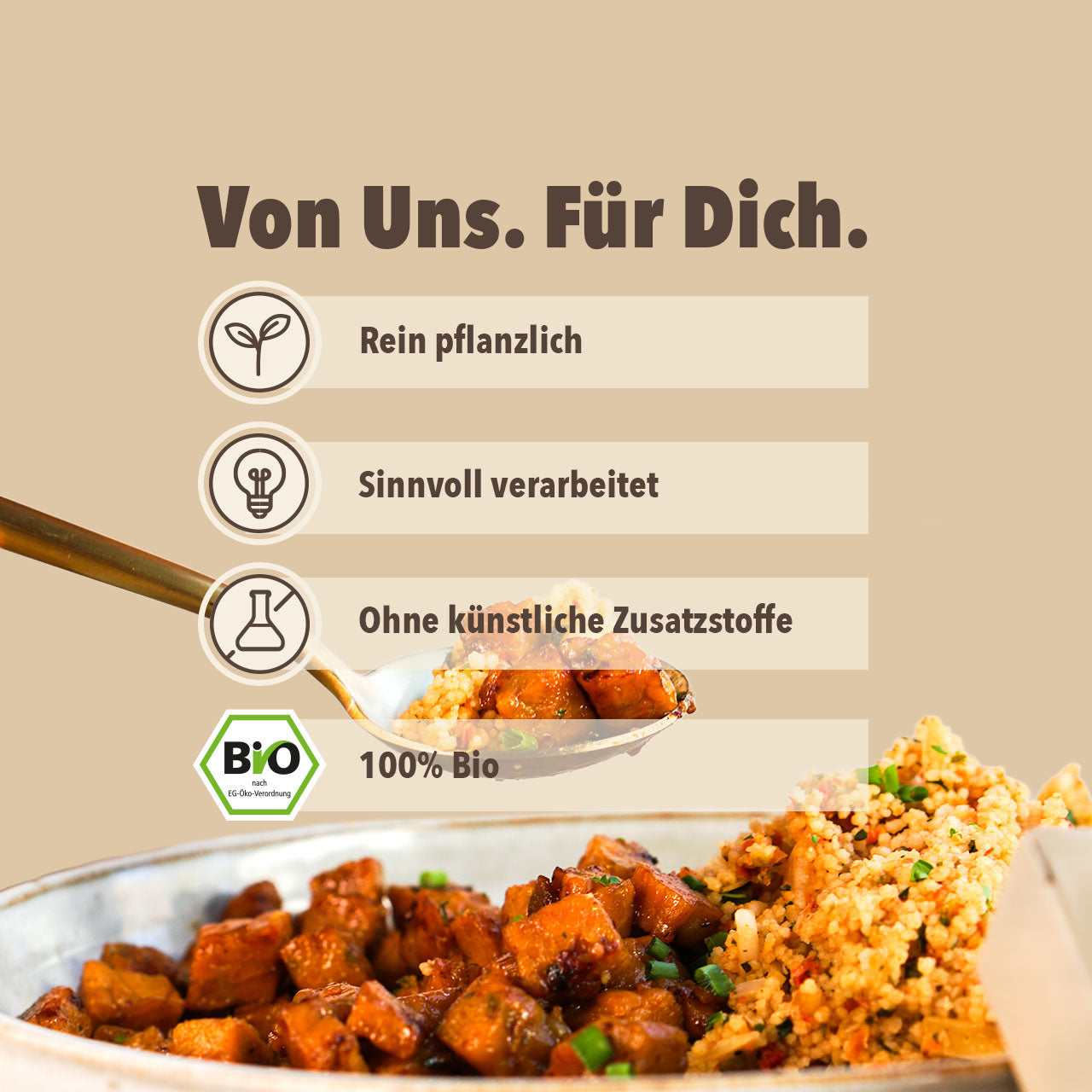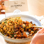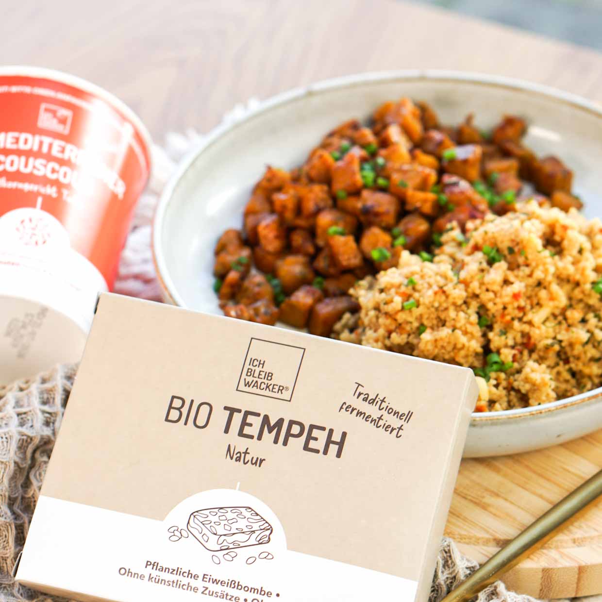 Aber wozu isst man Tempeh überhaupt? Zu asiatischen Gerichten passt er besonders gut. Doch er funktioniert ebenfalls in Bowls, zu Gemüse oder in Wraps. Das schöne an dem Tempeh? Du kannst ihn ganz individuell würzen und nach belieben dem Gericht deiner Wahl anpassen.