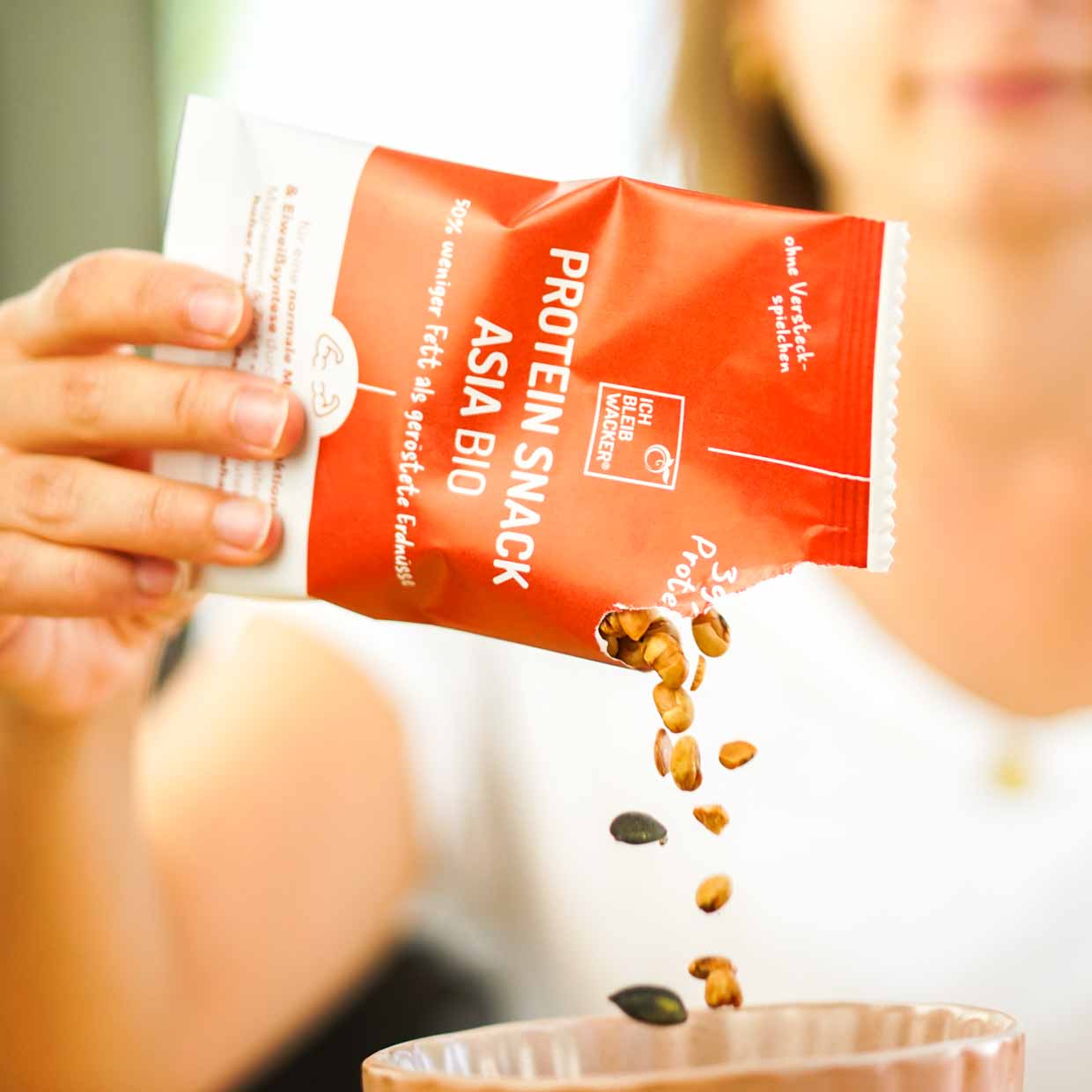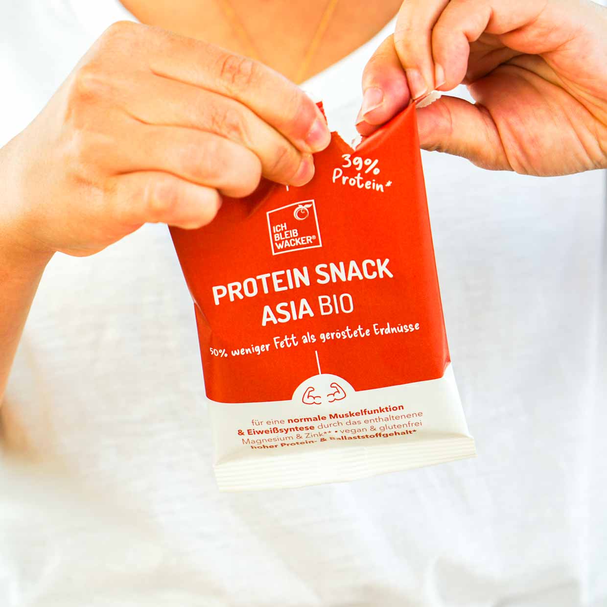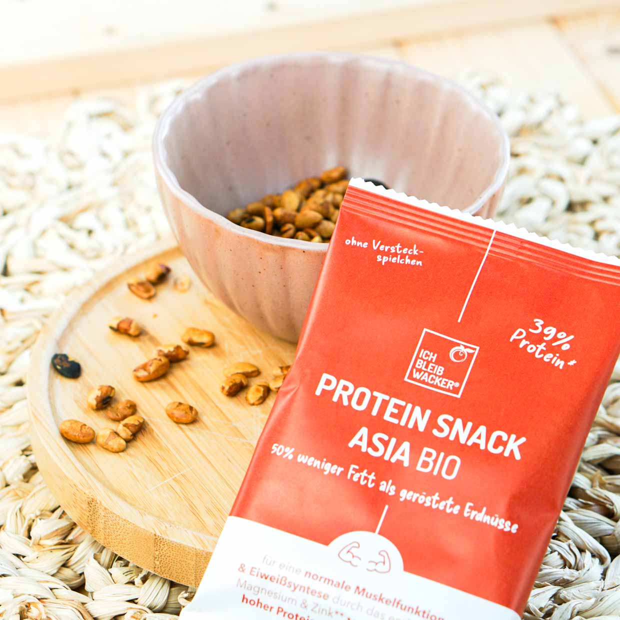 Ob als Topping für Salate, Suppen oder dein klassisches Mittagessen in der Kantine – der Proteinsnack Asia veredelt jedes Gericht und liefert eine ordentliche Portion Proteine. Auch für den kleinen Hunger zwischendurch ist dieser Snack perfekt. Besonders Menschen über 60 Jahren oder Sportler die mehr als 5h/Woche trainieren profitieren von einer leicht erhöhten Proteinzufuhr durch ihre alltägliche Ernährung. Proteine sind unerlässlich für das Muskelwachstum, und ohne die richtige Ernährung wird auch das intensivste Training nicht den gewünschten Erfolg bringen. Mit diesem Snack erhältst du reichlich Protein – und musst nicht auf hochverarbeiteten Protein-Isolaten zurückgreifen.