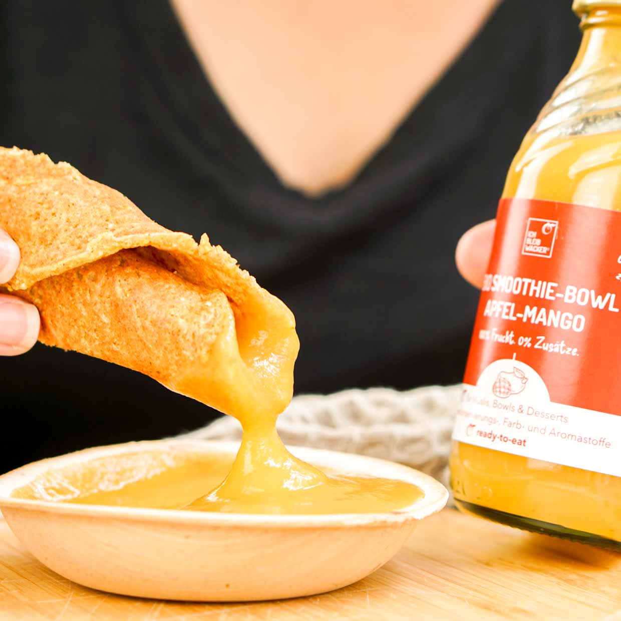 Genieße den puren Obst-Geschmack in deiner Müsli-Bowl! Einfach unsere Apfel-Mango-Sauce als Basis verwenden, mit etwas Müsli oder Haferflocken und frischem Obst toppen und fertig ist dein Frühstück voller Frucht und Liebe. Oder du verleihst deinen süßen Speisen wie Pancakes oder anderen Desserts einen exotischen Geschmack oder genießt die Sauce einfach pur als Smoothie.