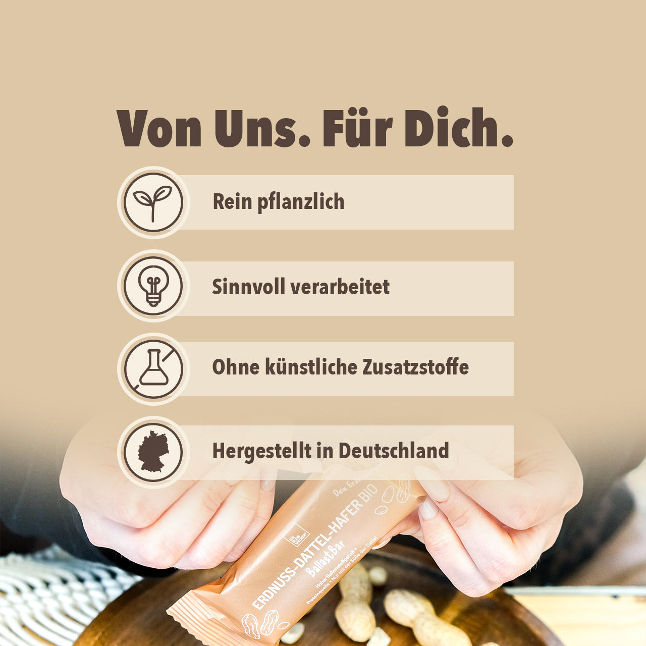 Der Erdnuss Dattel Hafer BallastBar begleitet dich durch den Tag.
