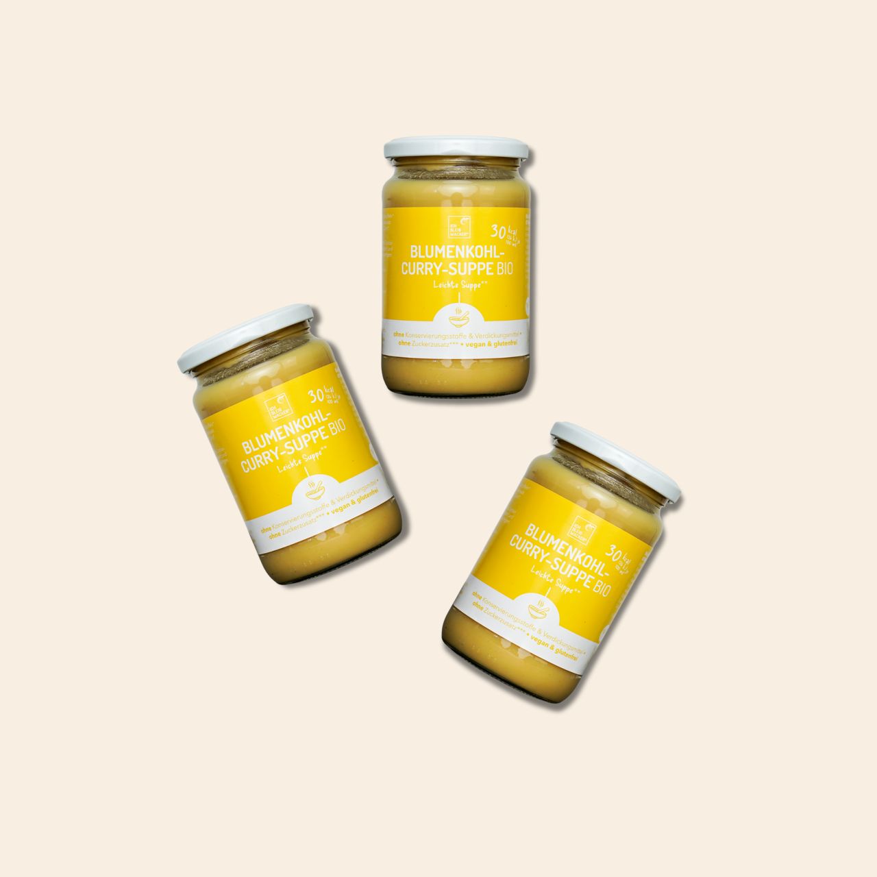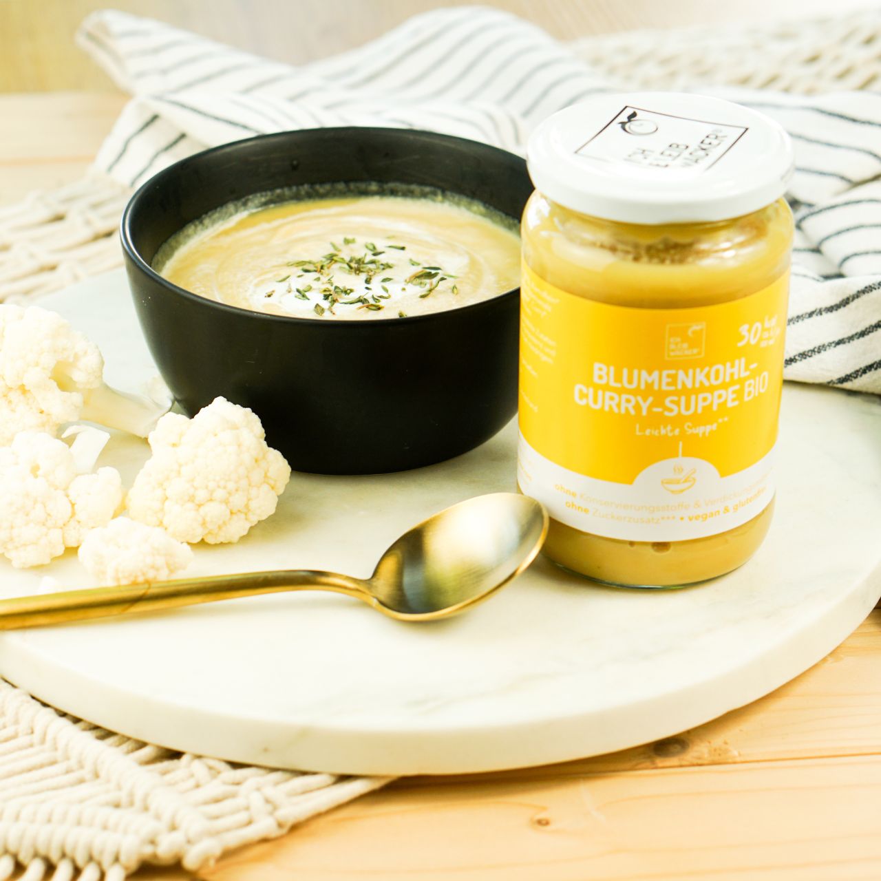 Unsere Blumenkohl-Currysuppe ist fett- und zuckerarm. Sie eignet sich perfekt als Fertiggericht, wenn es mal schnell gehen muss oder die Lust zum Kochen fehlt und trotzdem etwas Köstliches auf den Teller soll. Einfach schonend erhitzen und genießen!