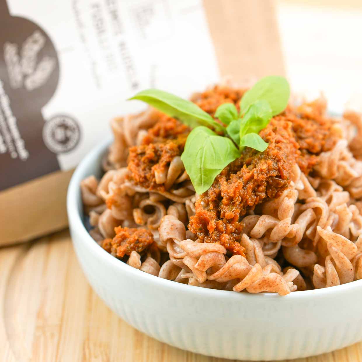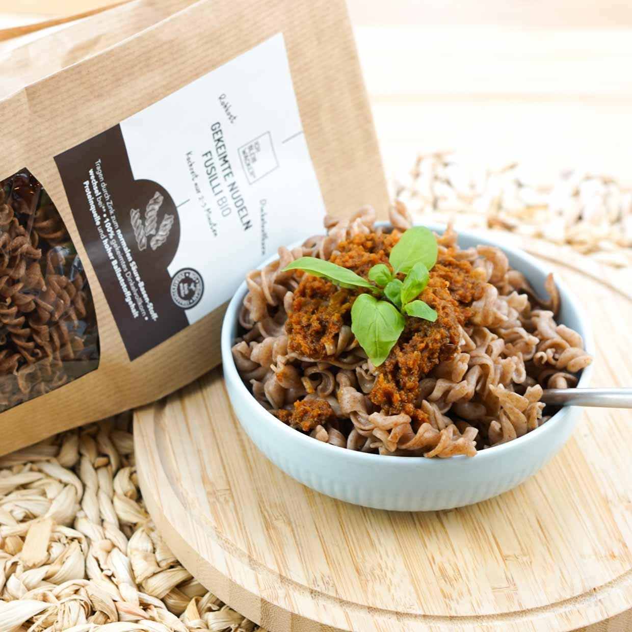 Gleichzeitig haben die gekeimten Fusilli eine besonders kurze Kochzeit. In nur zwei Minuten sind sie gar und bereit für dein Gericht.