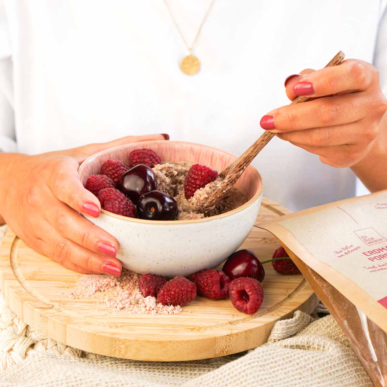 Unser Erdmandelporridge Himbeer-Sauerkirsche vereint die milde Süße der Erdmandel mit der fruchtigen Säure von Himbeeren und Sauerkirschen – für ein ausgewogenes Frühstück oder eine glutenfreie Mahlzeit zwischendurch.